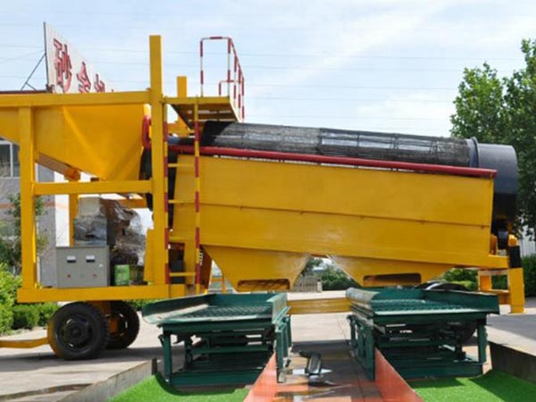 淘金设备 移动式滚筒筛是一种在陆地上可移动的筛分设备,它由汽车轮子承重,(根据产量决定轮子的数量),设备四周有机械调平装置,为吊车上的机械调平装置。 坚固耐用,每个液压调平装置承重可达15吨,大大超过所需承重。